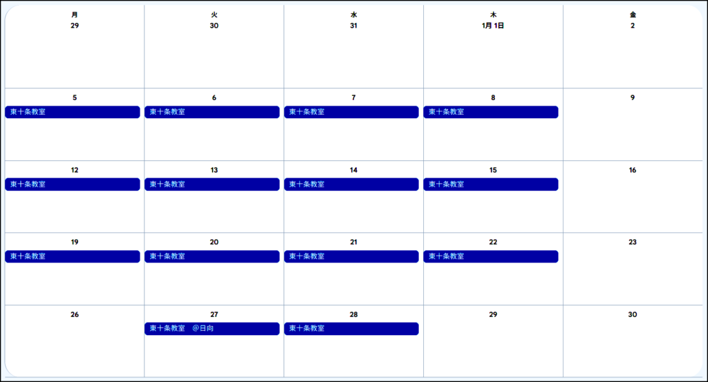 【1月のスケジュール】 ※26日は会場の都合お休みとなるため、12日(祝日)に開講いたします。また、27日(火)ですが、岩田先生に代わり日向が講師をつとめます。