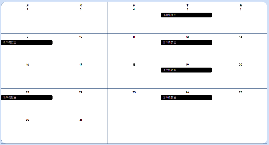 ※ 月曜日午前中、大人の一般部を開講いたしました。10時~12時です。